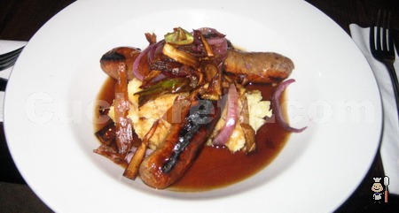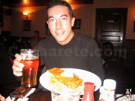 Cristóbal, sin embargo, se decanta por las ya comentadas Sausage & Mash en su tamaño Standard (£5.95) aunque también está disponible uno mayor, el Large (£8.95). Unas salchicas de cerdo preparadas con una receta originaria de Oxford servida sobre puré de patatas y salsa de cebolla. Se encuentra además una opción disponible para vegetarianos a base de salchichas vegetarianas, zanahoria y cebolla. Pero no es éste el caso.