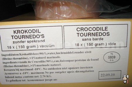 Nos sorprendieron y se presentaron en la mesa con la caja en la que ellos reciben la carne. Es más, no sólo nos trajeron la caja del cocodrilo sino también la del bisonte. Como nosotros lo vimos, también vosotros, por eso Rayo hizo esta fotografía a modo de certificación de que realmente íbamos a comer cocodrilo y bisonte auténticos.