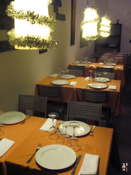 Nos topamos, como se puede apreciar en la siguiente instantánea, con los motivos navideños de temporada ya colocados, aderezando la iluminación propia del establecimiento. Las mesas se encuentran flanqueadas por sillas en tonos metálicos y vienen vestidas con unos manteles anaranjados sobre los que destacan sus servilletas en tela blanca bien parecida. Las sillas, además, poseen un acolchado cómodo sobre el que asentarnos, aunque el conjunto no destaca especialmente por la cubertería ni la cristalería o la vajilla. Se podrían definir básicamente como apropiadas y funcionales. Sobre el tono y diseño del mantel, todos apuntamos a la idea de que habría mejorado habiéndole dado una vuelta más de tuerca en su elección.