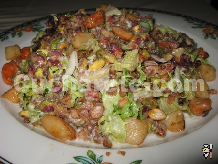 Viento en popa, a toda vela, acude raudo y veloz el siguiente entrante. Al recitar su nombre en carta, bien podríamos pensar -será la costumbre- que la colorida y atrevida Ensalada de vieiras, hoja de roble y pistacho, sería simplemente una ensalada más. Sin embargo y, como bien se puede observar en el siguiente primer plano, su contenido se encuentra repleto de pedacitos de vieiras y pistacho. Al mismo tiempo que, no tanto, de hoja de roble. Una enorme ración realizada con el mismo cariño que nuestras madres o abuelas le dedicarían, utilizando gran cantidad de sus ingredientes principales. Aquellos que tanto nos deleitan.