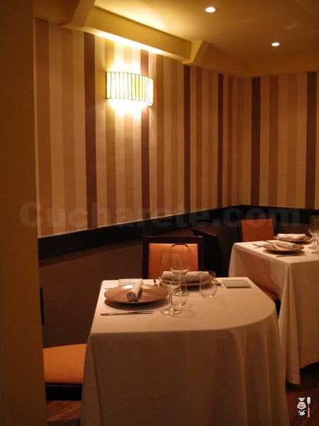 El segundo espacio aparece formando parte de un amplio pasillo que comunica su entrada con el comedor central. En él encontramos dos mesas para dos comensales, dispuestas de tal manera que la intimidad de una no afecta a la otra. Aquí, las paredes se han vestido con un papel a rayas en tonos marrones que aportan calidez. Desde luego, cualquiera de estas mesas puede ser perfecta para una comida o cena romántica en la que los enamorados no sólo tendrán abiertas las puertas de sus corazones sino también sus estómagos, pues a buen seguro degustarán platos que afianzarán sus gustos gastronómicos.
