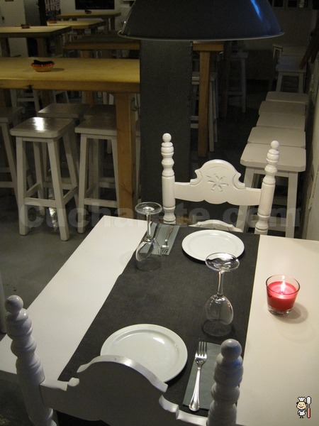 Las mesas son amplias e ideales, como no podía ser de otro modo, para compartir tapas, pinchos y raciones. Aparecen vestidas con un camino gris oscuro y una servilleta de papel gris perla. La vajilla, cubertería y cristalería están acordes a la categoría del local. Además, como ya he mencionado antes, cada mesa se marca con una lámpara que reparte su luz directamente sobre ella y una velita que nunca está de más, estemos en el más exclusivo restaurante o, como en este caso, en una taberna “latinera”.