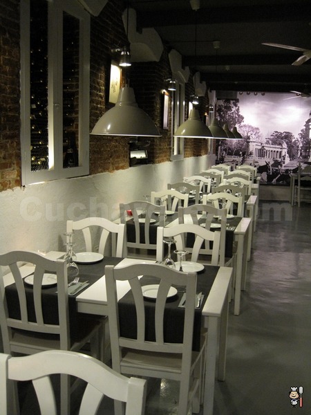 Si en la zona de mesas altas el blanco inmaculado era el protagonista indiscutible, en la de comedor no pierde su vigencia aunque queda más patente la presencia del ladrillo visto original del local en sus paredes. Cómo no dejar que respiren unos ladrillos que han sido parte de un peladero de pollos, una vaquería e incluso un anticuario… Y es que, la Taberna Los Austrias está llena de historia, y eso se nota sólo con sentarte a una de sus mesas.